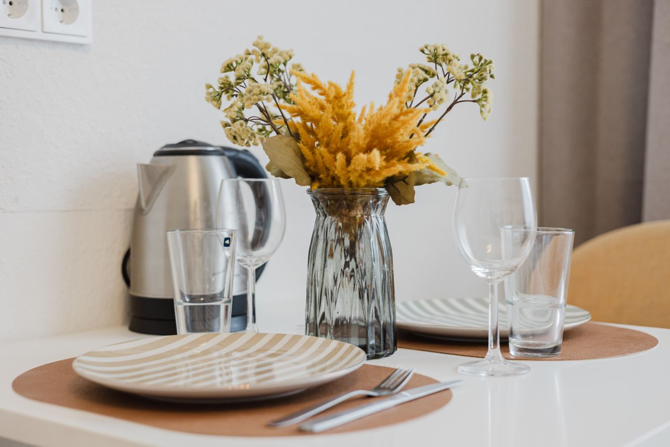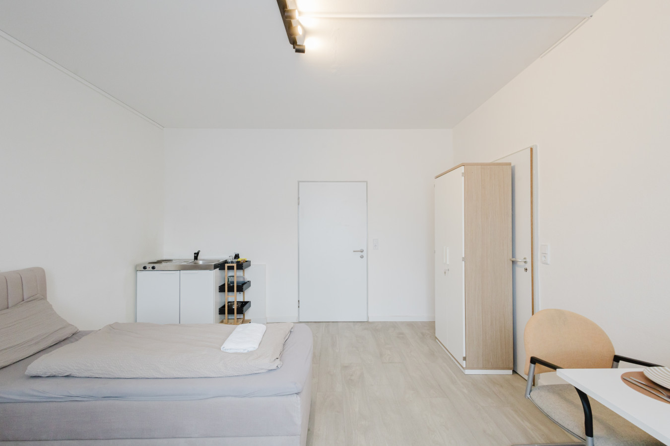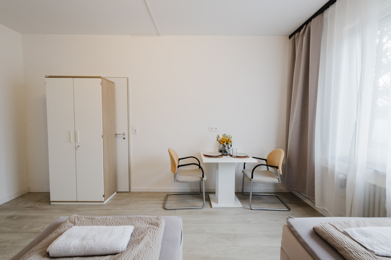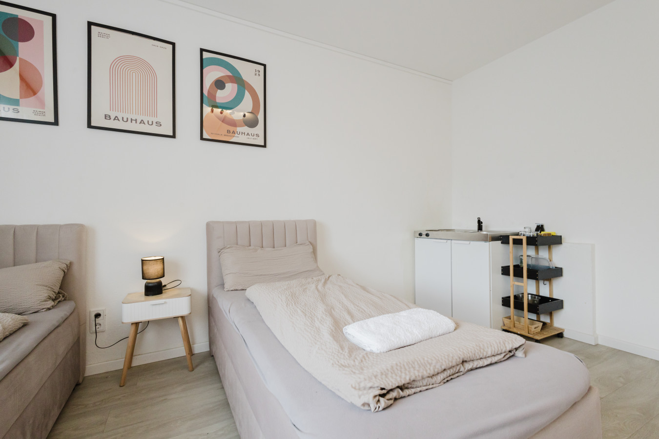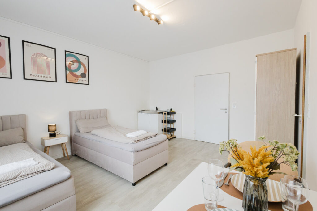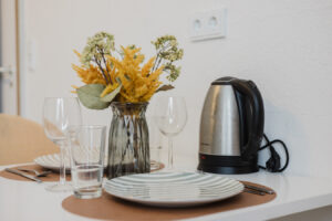 Our rooms are modern and minimalistic, featuring stylish furniture and everything you need for a comfortable stay. Depending on the room category, you will either have a private kitchenette in your room or access to a shared kitchen. Kitchen utensils and a coffee machine are available – perfect if you want to stay flexible and prepare your own meals.