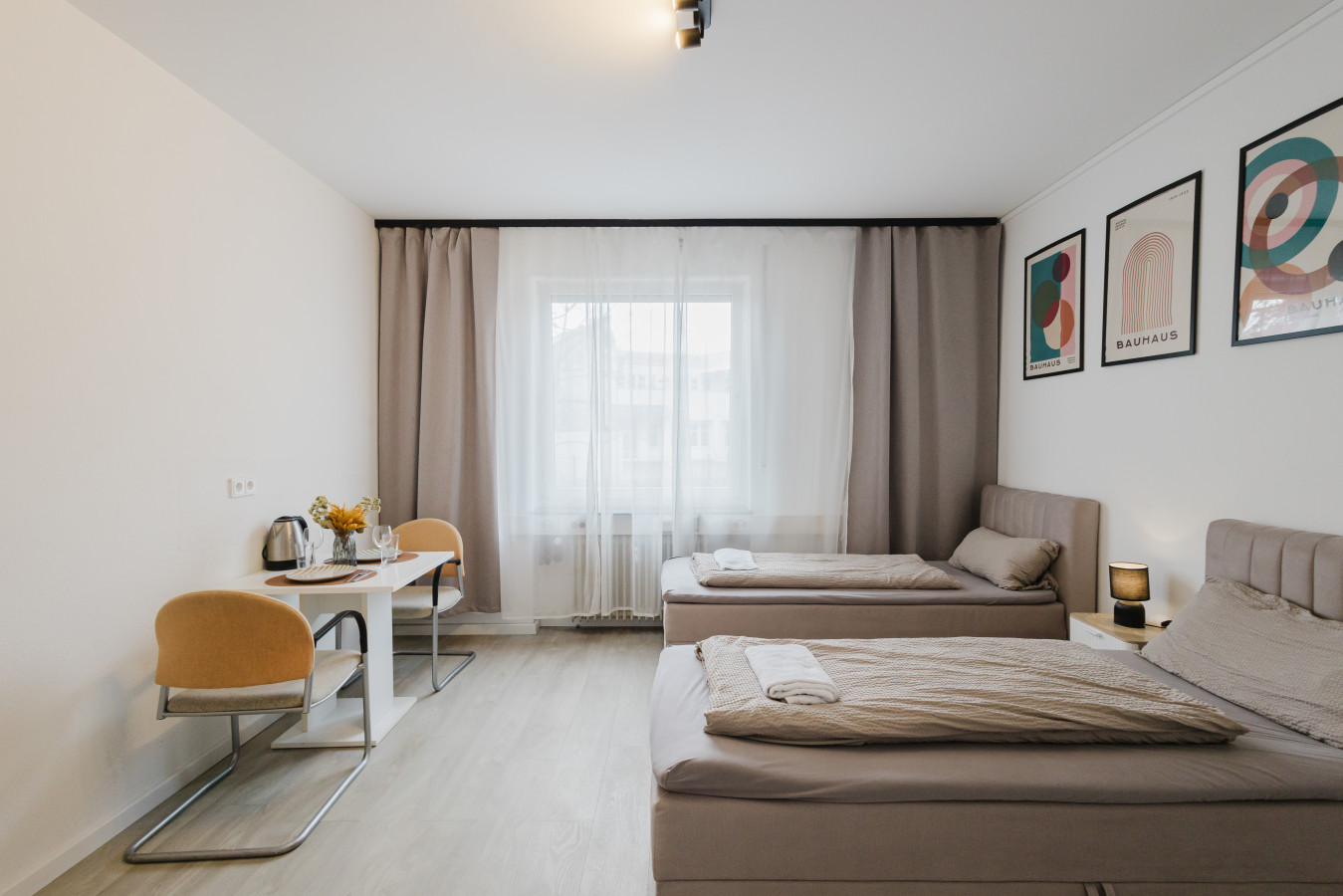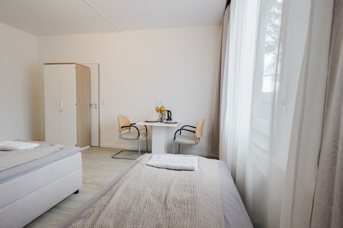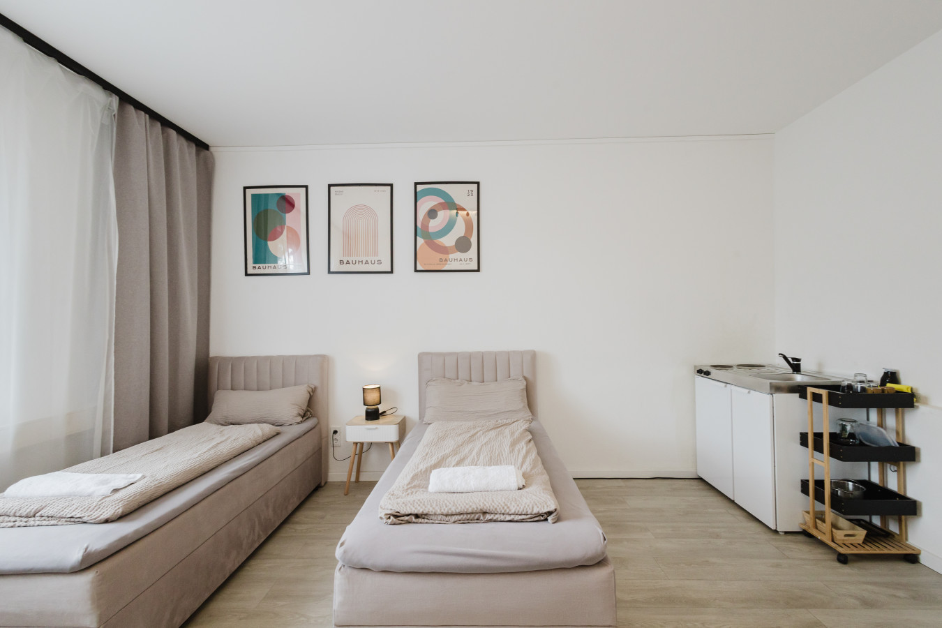 Our rooms are modern and minimalistic, featuring stylish furniture and everything you need for a comfortable stay. Depending on the room category, you will either have a private kitchenette in your room or access to a shared kitchen. Kitchen utensils and a coffee machine are available – perfect if you want to stay flexible and prepare your own meals.
