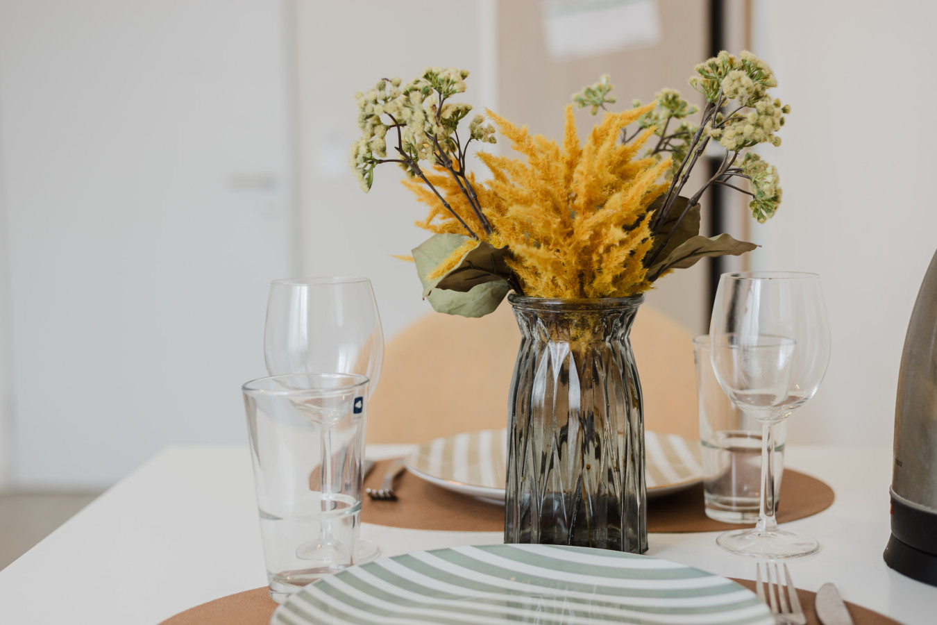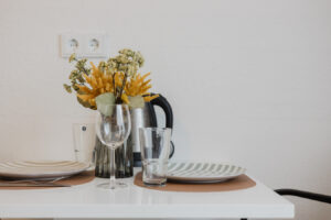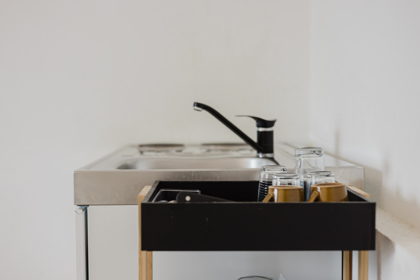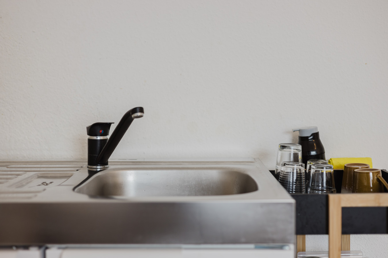 Our rooms are modern and minimalistic, featuring stylish furniture and everything you need for a comfortable stay. Depending on the room category, you will either have a private kitchenette in your room or access to a shared kitchen. Kitchen utensils and a coffee machine are available – perfect if you want to stay flexible and prepare your own meals.