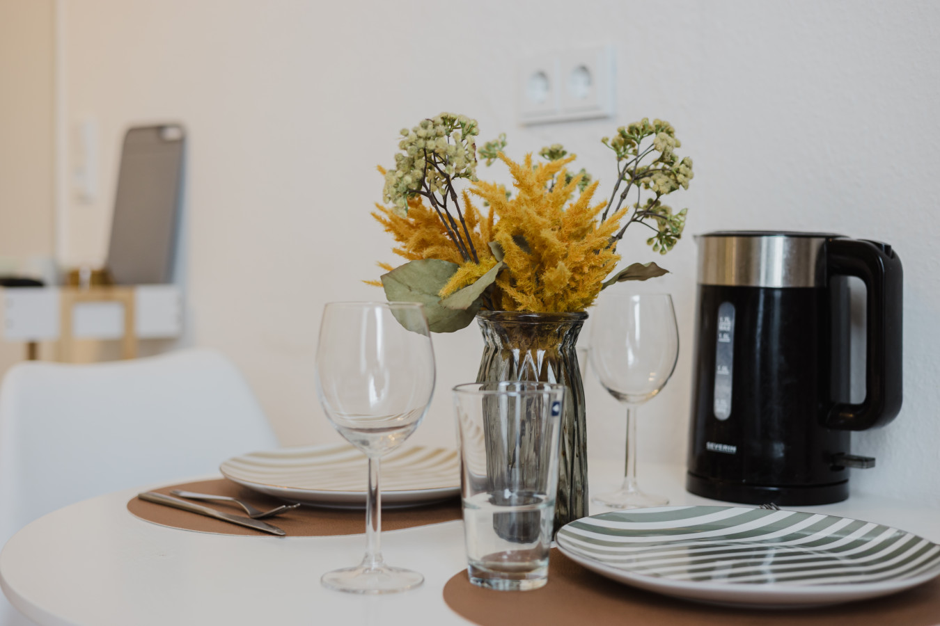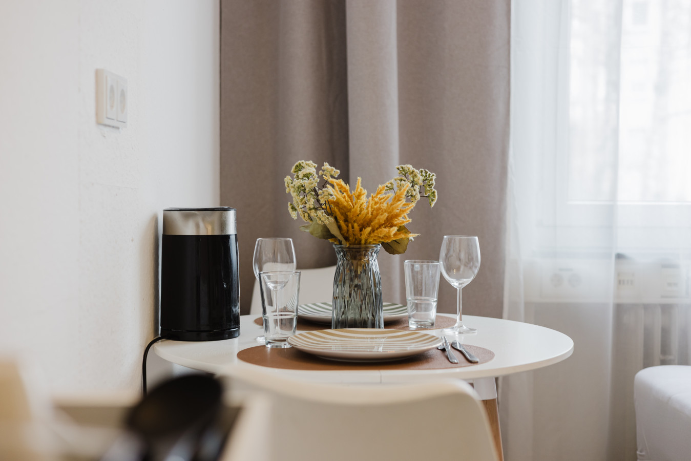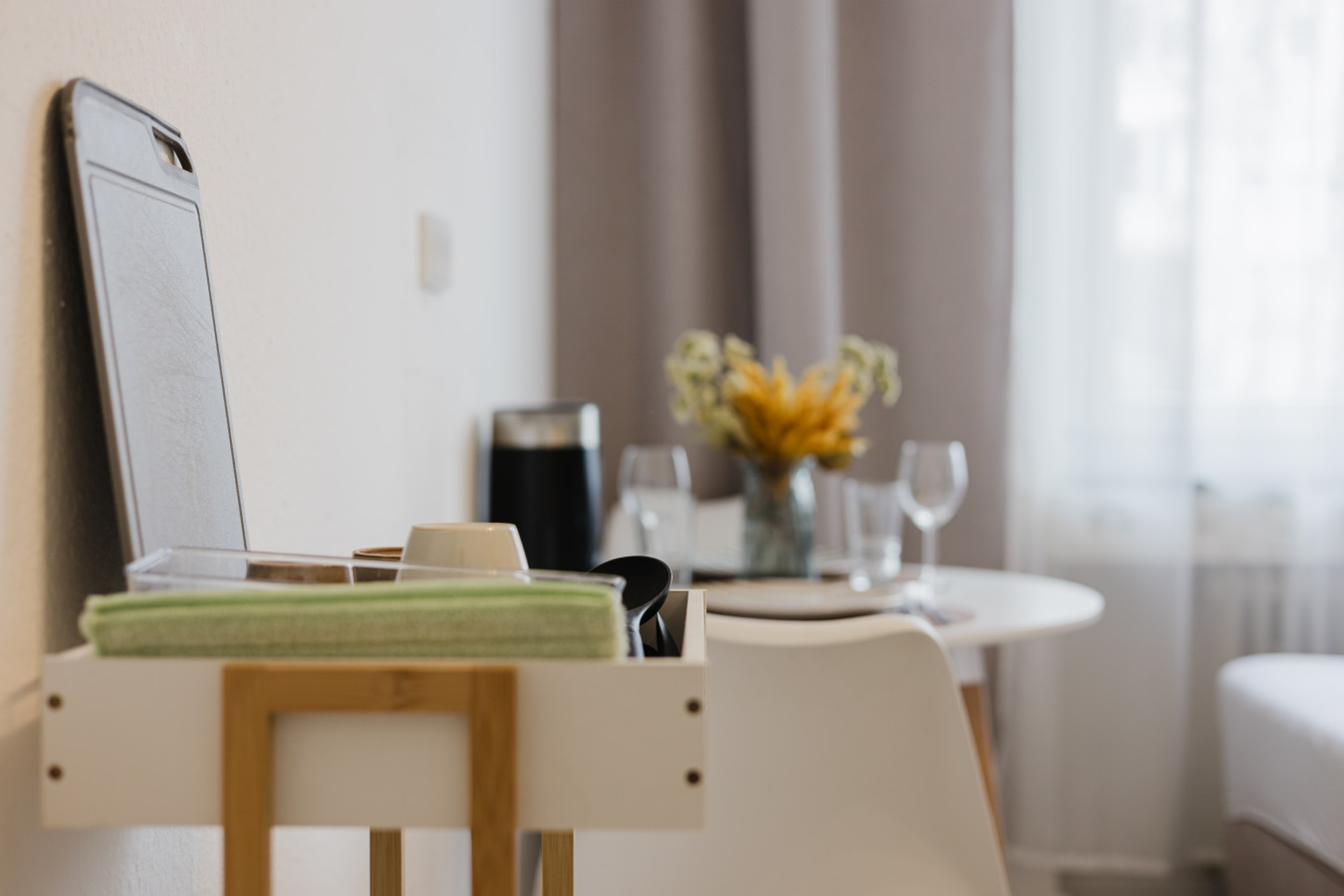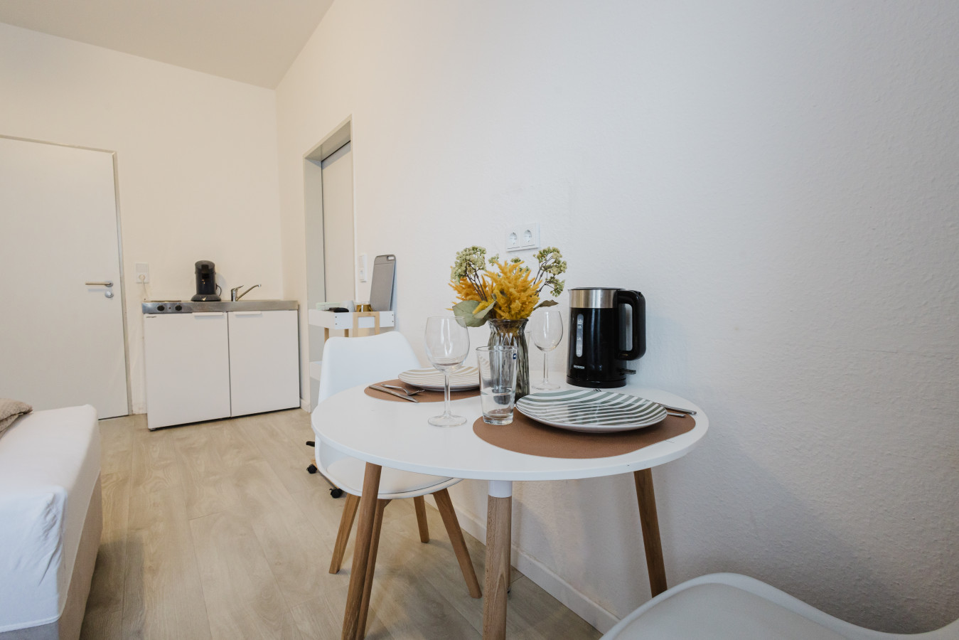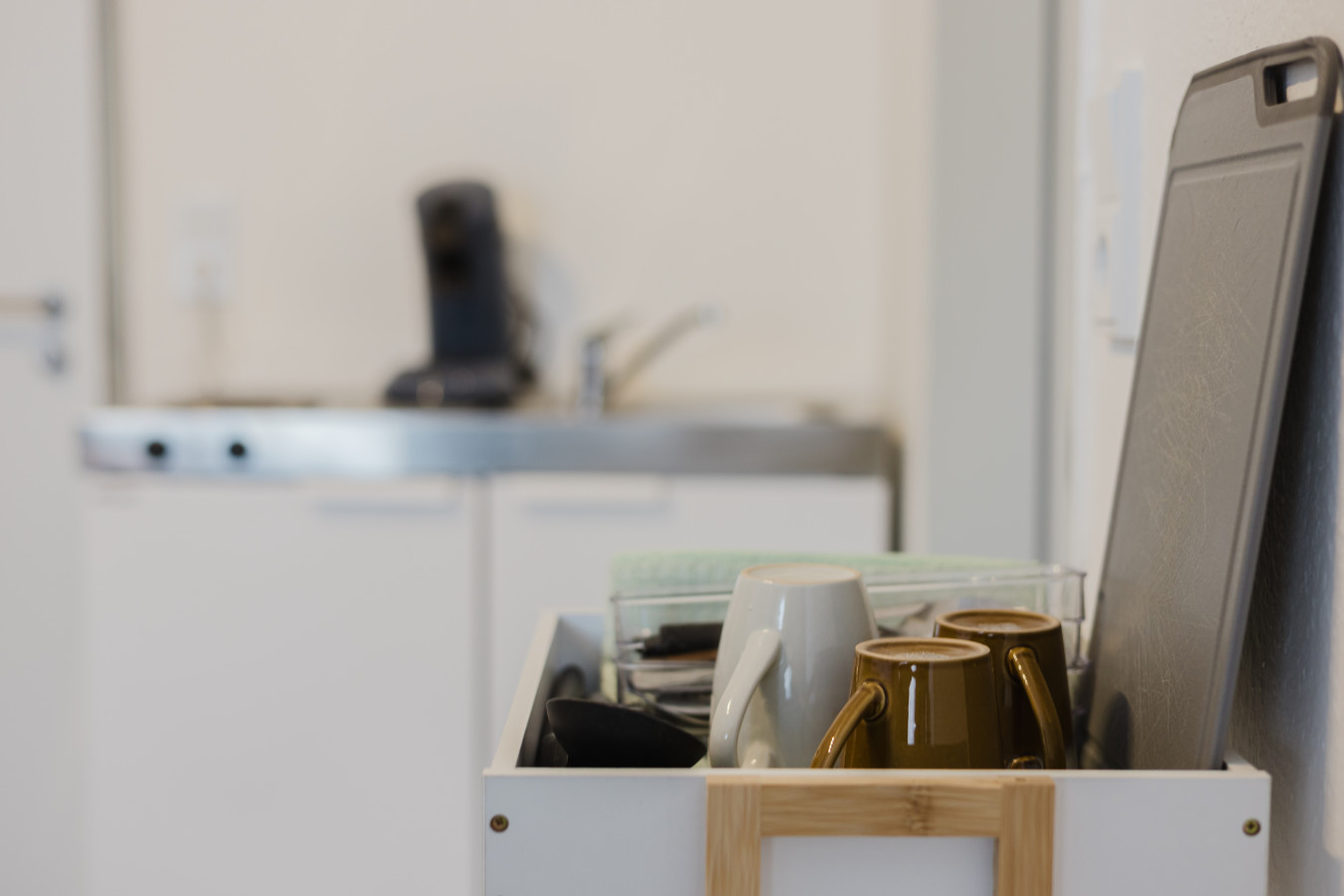 Our rooms are modern and minimalistic, featuring stylish furniture and everything you need for a comfortable stay. Depending on the room category, you will either have a private kitchenette in your room or access to a shared kitchen. Kitchen utensils and a coffee machine are available – perfect if you want to stay flexible and prepare your own meals.