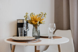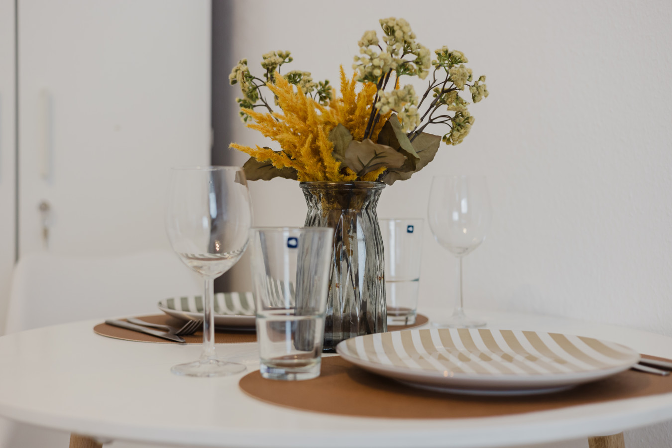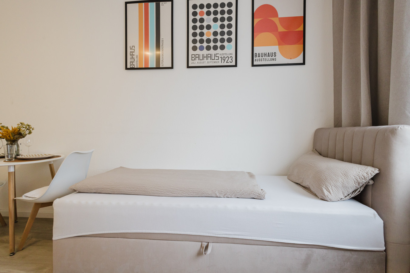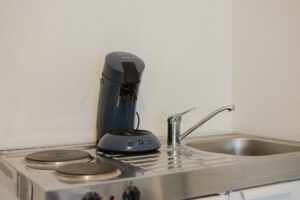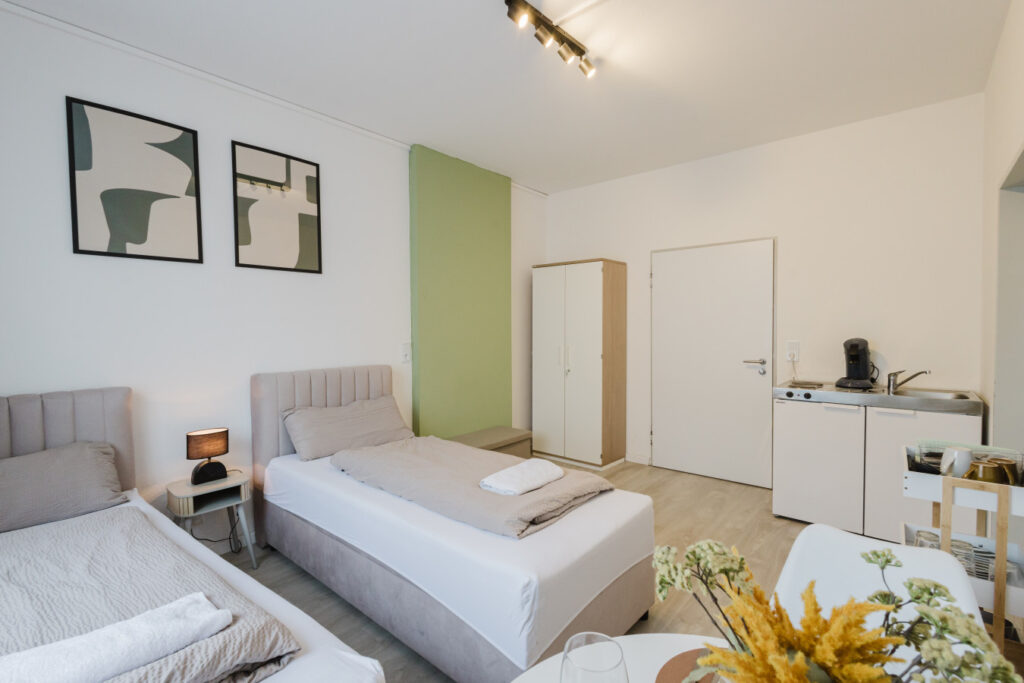 Our rooms are modern and minimalistic, featuring stylish furniture and everything you need for a comfortable stay. Depending on the room category, you will either have a private kitchenette in your room or access to a shared kitchen. Kitchen utensils and a coffee machine are available – perfect if you want to stay flexible and prepare your own meals.