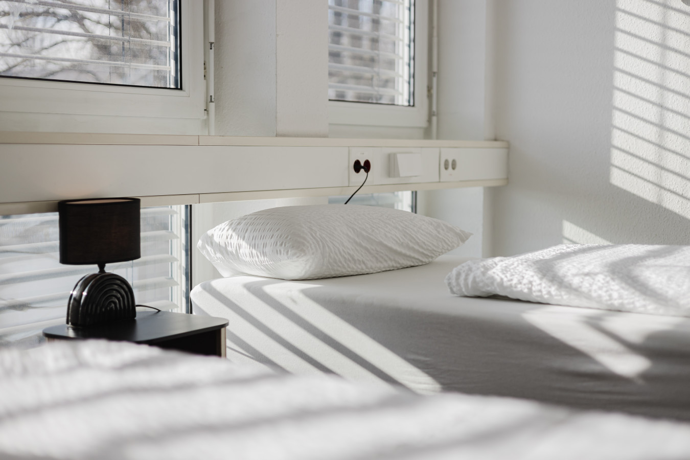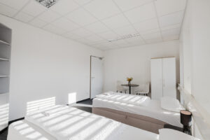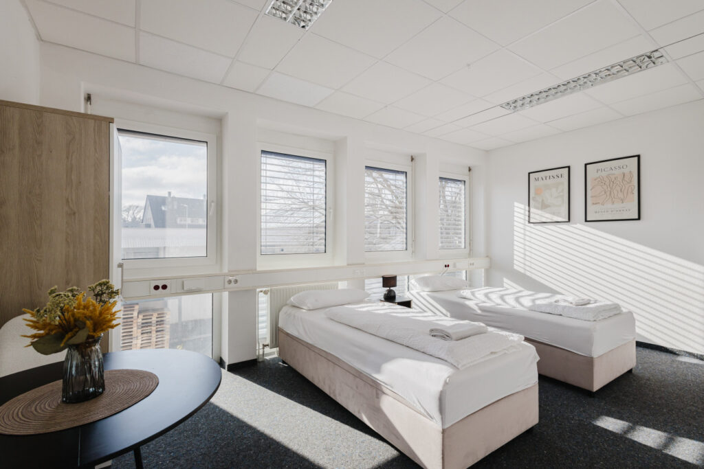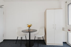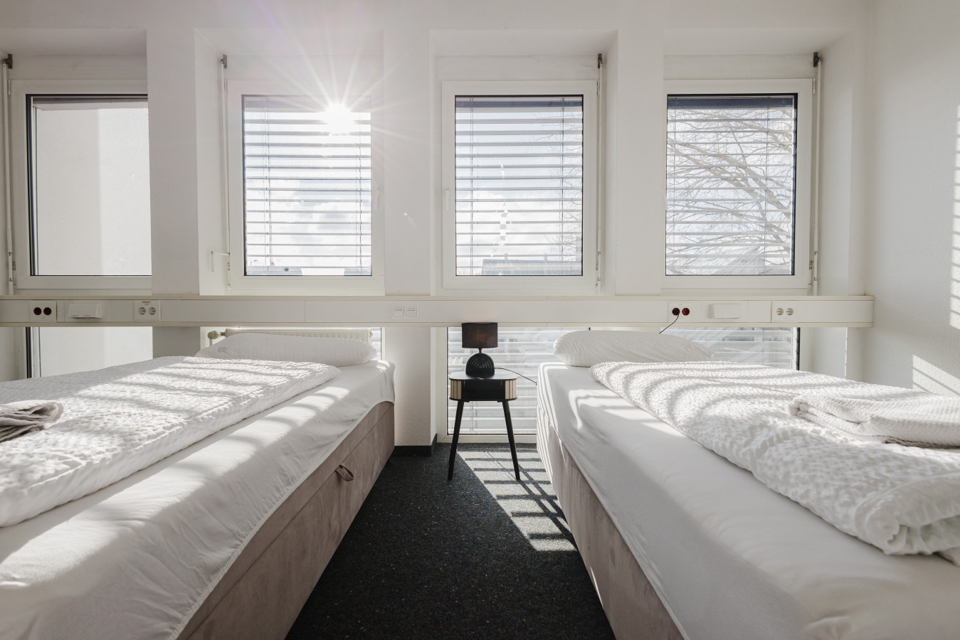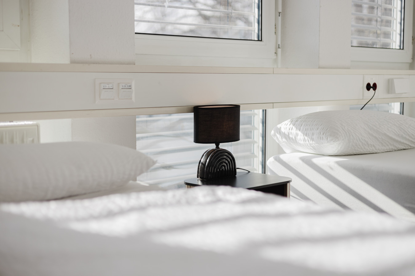 Our rooms are modern and minimalistic, featuring stylish furniture and everything you need for a comfortable stay. A shared kitchen is available for all guests, including kitchen utensils and a coffee machine – perfect if you want to stay flexible and prepare your own meals.