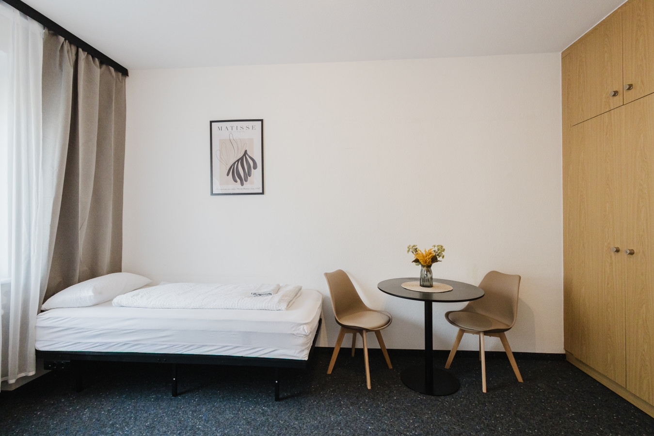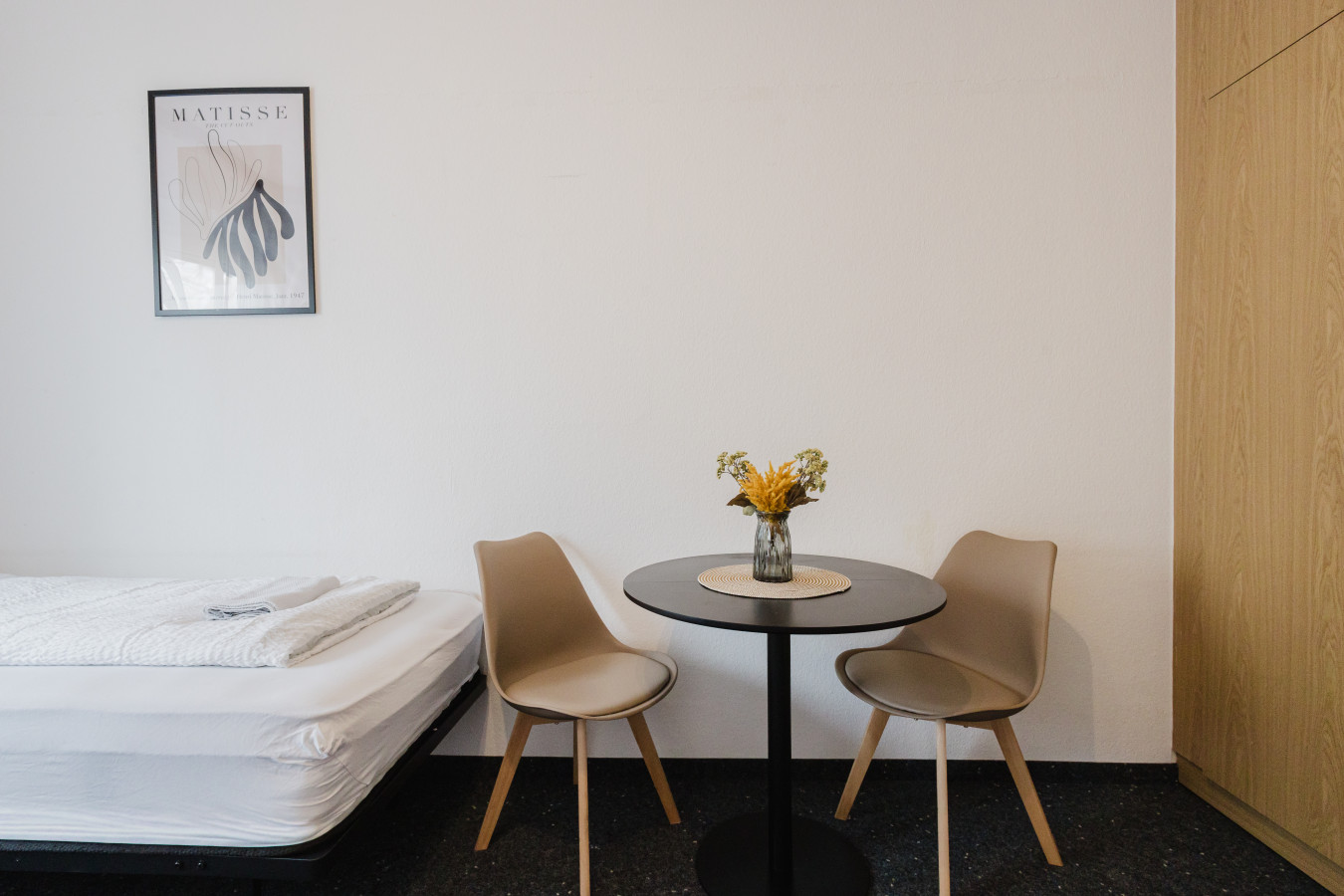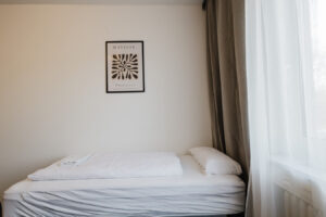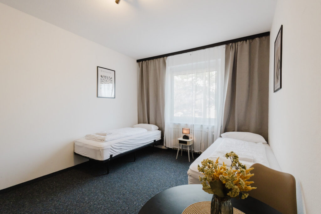 Our rooms are modern and minimalistic, featuring stylish furniture and everything you need for a comfortable stay. A shared kitchen is available for all guests, including kitchen utensils and a coffee machine – perfect if you want to stay flexible and prepare your own meals.