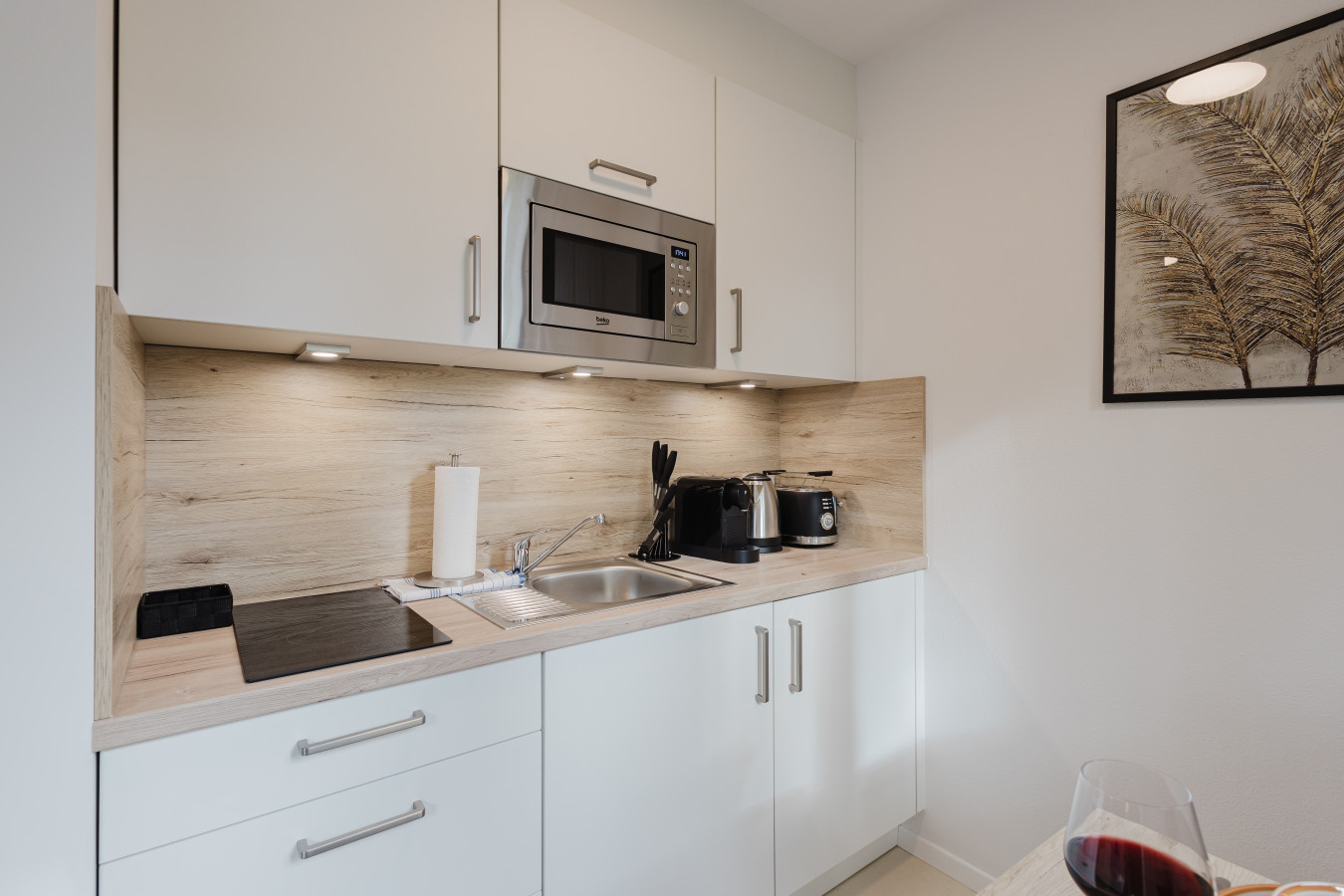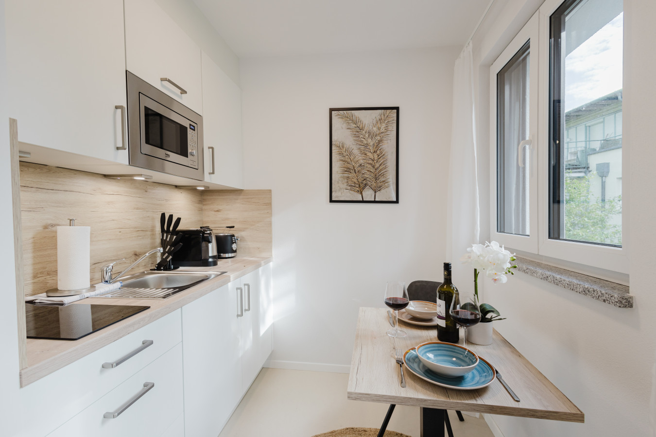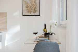 ✔ Fully equipped kitchen with stove, coffee maker, kettle, tea station, and complete kitchenware