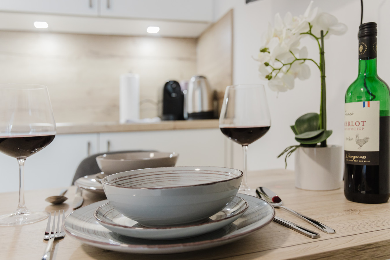 ✔ Fully equipped kitchen with stove, oven, coffee maker, kettle, tea station, and complete kitchenware