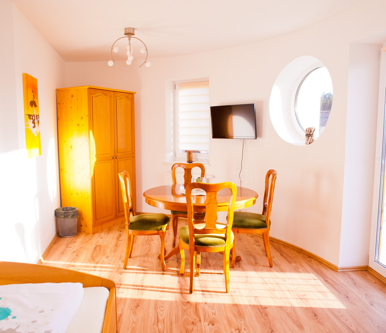 Inside, the suite includes a comfortable double bed, a private bathroom with shower and toilet, a small dining area, a wardrobe, and a TV, providing everything needed for a pleasant stay.